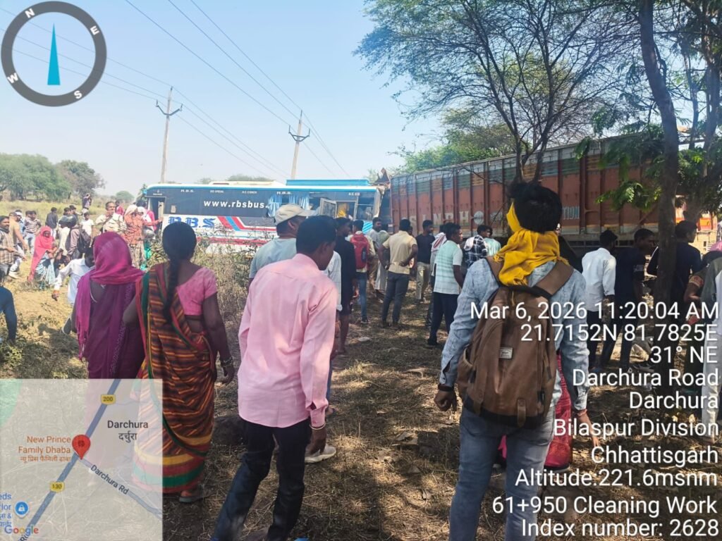 दरचुरा। आज दिनांक 06 मार्च 2026 को लगभग सुबह 11:00 बजे बिलासपुर से रायपुर की ओर जा रही आरबीएस कंपनी की यात्री बस दरचुरा ग्राम के पास सवारी उठाने के लिए धीमी हुई। इसी दौरान पीछे से आ रहे ट्रक क्रमांक MH 37 T 1821 के चालक ने तेज गति और लापरवाहीपूर्वक वाहन चलाते हुए बस को जोरदार टक्कर मार दी।