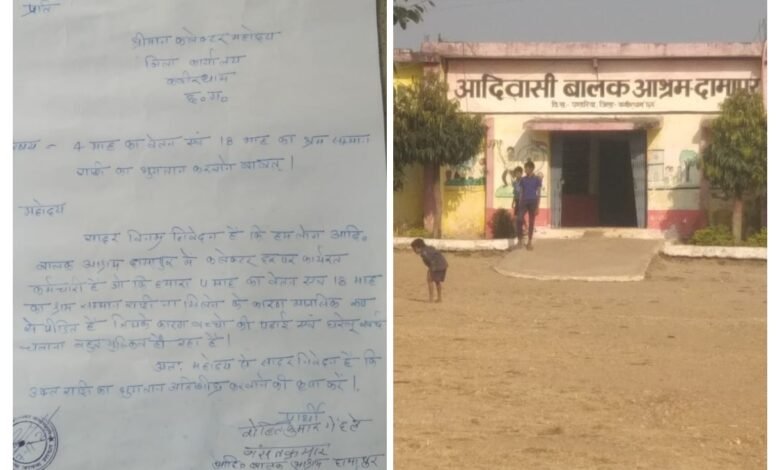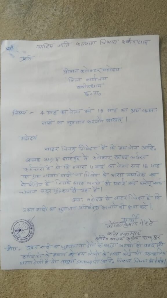 कबीरधाम। पंडरिया ब्लॉक के आदिम जाति बालक आश्रम दामापुर में पदस्थ कर्मचारी रोहित कुमार गेंदले द्वारा वेतन व श्रम-सम्मान राशि न मिलने की गंभीर समस्या सामने आई है। कर्मचारी ने आश्रम अधीक्षक और जिला कलेक्टर को लिखित आवेदन देकर बताया है कि विभाग की लचर व्यवस्था के कारण उन्हें पिछले पांच माह से वेतन तथा 18 वर्ष की सेवाकाल की श्रम-सम्मान राशि प्राप्त नहीं हुई है। आर्थिक संकट इस कदर गहरा गया है कि परिवार का भरण-पोषण और बच्चों की पढ़ाई तक प्रभावित होने लगी है।