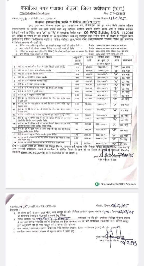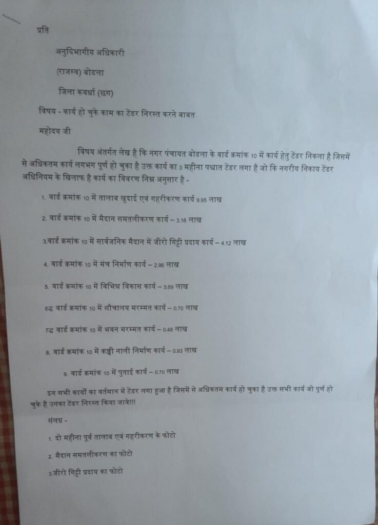 बोड़ला – शहर कांग्रेस कमेटी बोडला द्वारा नगर पंचायत बोडला के वार्ड क्रमांक 10 में निकले टेंडर के विरोध में मुख्य नगर पालिका अधिकारी एवं अनुविभागीय अधिकारी राजस्व बोडला को फर्जी टेंडर निरस्त करने की मांग की गई वार्ड क्रमांक 10 में लगभग 26 लाख रुपए के काम की टेंडर निकाली गई है जिसमें से अधिकांश कार्य दो महीना पूर्व किया जा चुका है और अभी बैक डेट में टेंडर लगाया गया इसके अलावा नगर
